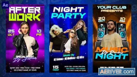 3 Night party social media templates. This reels/stories pack features 3 animated templates, each 15 seconds long. You can easily customize the text, colors, and media to match your content. Everything is well-organized and simple to use. No plugins are required. The project comes in 1080×1920 vertical resolution and includes a step-by-step video tutorial and free font links. Perfect for all your social media content. Enjoy it!